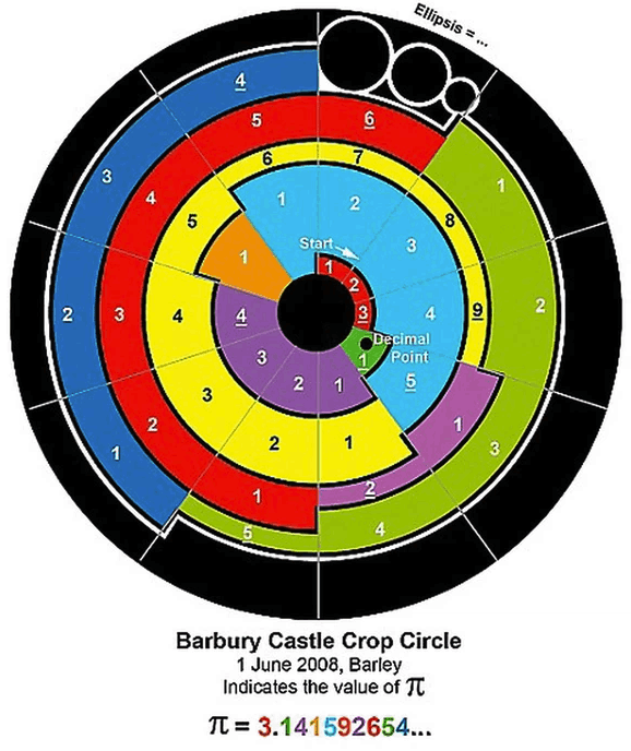 Auch hier stellt sich die Frage, wie eine Gruppe von Spaßvögeln so etwas in solch erstaunlicher Präzision in nur einer Nacht anlegen könnte – ohne irgendeine Spur zu hinterlassen und ohne dabei erwischt zu werden. Noch dazu liegt in der Geometrie dieses Kornkreises eine intelligente mathematische Symbolik verborgen: Achten Sie einmal auf die spiralförmige Linie, die an verschiedenen Stellen jeweils durch rechtwinklige „Sprünge“ nach außen geschoben wird. Die Abstände zwischen diesen „Sprüngen“ sind unterschiedlich lang. Außerdem sieht man direkt hinter dem ersten rechtwinkligen „Sprung“ (vom Zentrum aus gesehen) einen kleinen Punkt sowie drei weitere, größere Punkte ganz am Ende der Spirale. Dass diese Anordnung wohl nicht zufällig gewählt ist, fand als erstes der Astrophysiker Michael Reed heraus: Teilt man den Kornkreis in zehn gleich große Segmente und verfolgt man dabei die rechtwinkligen „Sprünge“ in der Spirallinie, lässt sich aus diesem Kornkreis die berühmte Kreiszahl Pi ablesen.