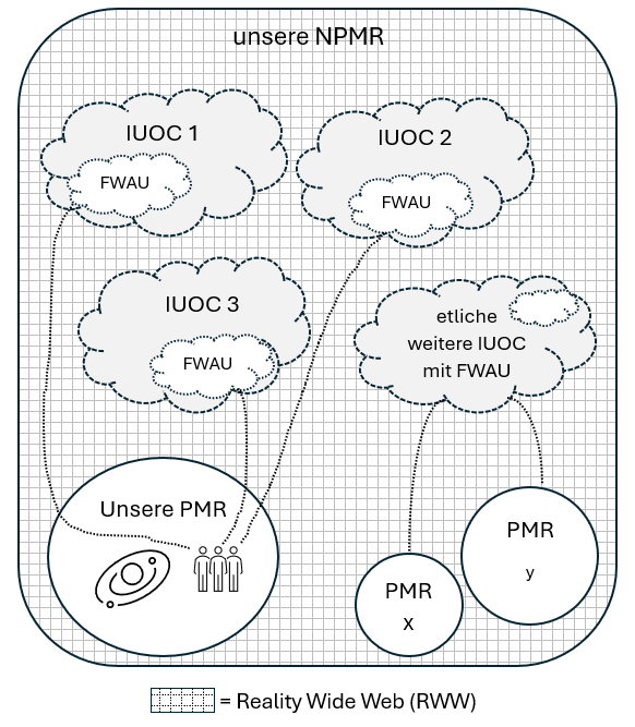 Die Abbildung zeigt exemplarisch und schematisch Entitäten (IUOC, FWAU) und physische Simulationen (PMR) in unserer nichtphysischen Realität (NPMR). Alle nichtphysischen Entitäten können miteinander kommunizieren, weil sie alle Bestandteile eines größeren Bewusstseinssystems sind und deshalb untereinander verbunden sind. Das wird hier metaphorisch durch das Gitternetz (RWW) dargestellt. Weil es nicht nur unsere, sondern unzählige weitere NPMR gibt, erstreckt sich das RWW weit darüber hinaus und umfasst letztlich das gesamte Bewusstseinssystem (Larger Consciousness System, LCS).
