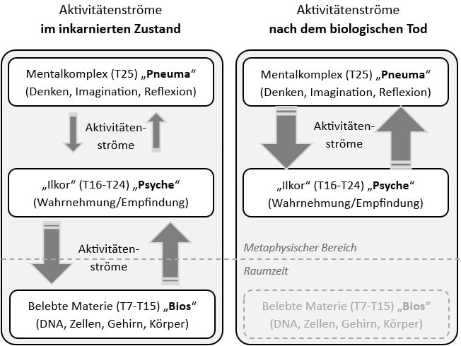 Aktivitätenströme können dann also nur noch zwischen „Psyche“ und „Pneuma“ ausgetauscht werden. Zur Erinnerung: Während der Bereich der „Psyche“ die Wahrnehmungen und Empfindungen umspannt, vollziehen sich im Mentalbereich des „Pneuma“ unsere bewussten Gedanken und Reflexionen. Wahrnehmungen finden also weiterhin statt, sie werden aber nicht mehr durch die körperlichen Signale des „Bios“ gespeist. Stattdessen nehmen wir Eindrücke wahr, die sich auf einer rein geistigen Sphäre abspielen, weil sich nun sämtliche Aktivitätenströme hierhin verlagern.